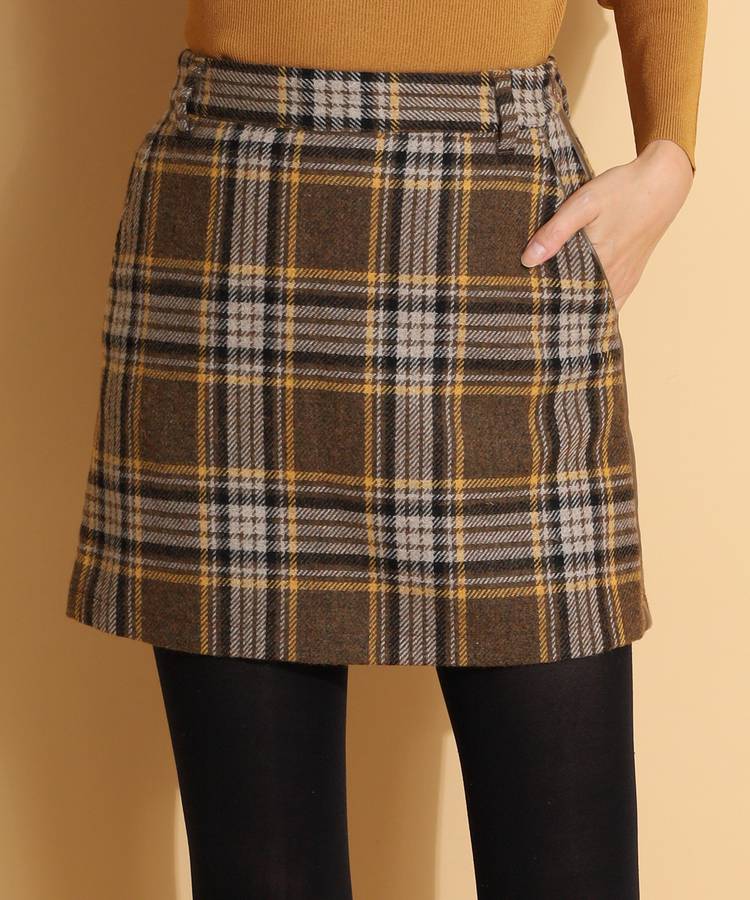 JR ぺチパンツ付き合皮ライン使いウール混チェックスカート