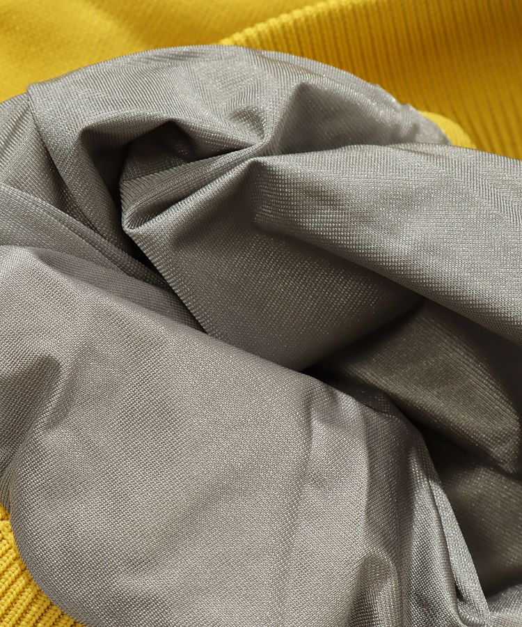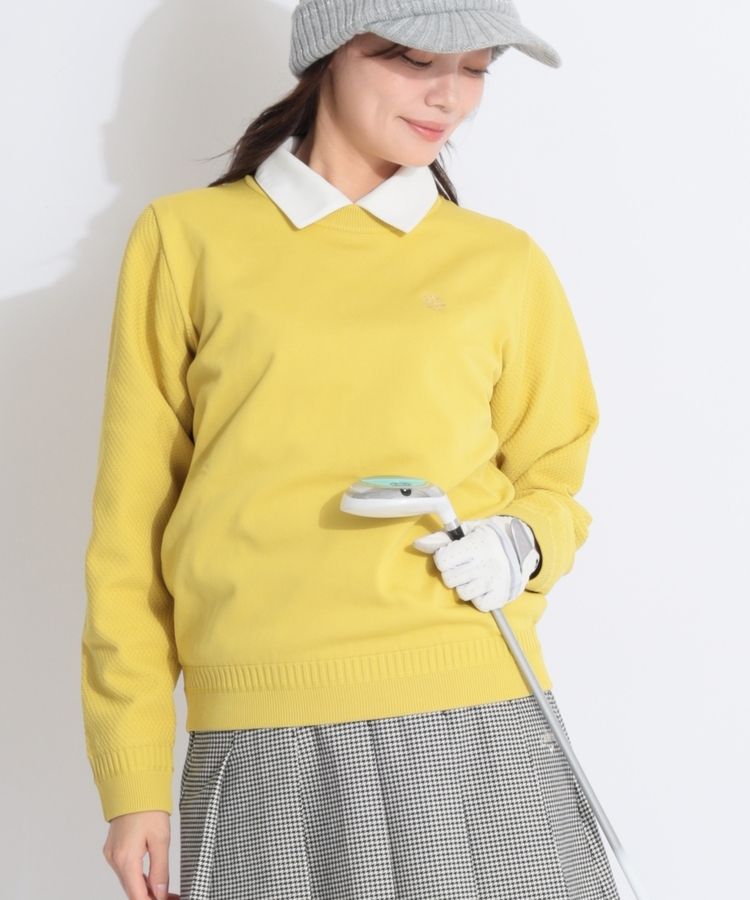 さらっと軽くて着心地のいいポリニット素材を使用。 裏地付きで風を通しにくく、秋ラウンドにもちょうどいい一枚。 胸元のラメロゴ刺繍やバックプレートが、さりげなく華やかさをプラス! コーデにイエローを差し色で入れると、ぐっと明るく軽やかな印象に仕上がります。