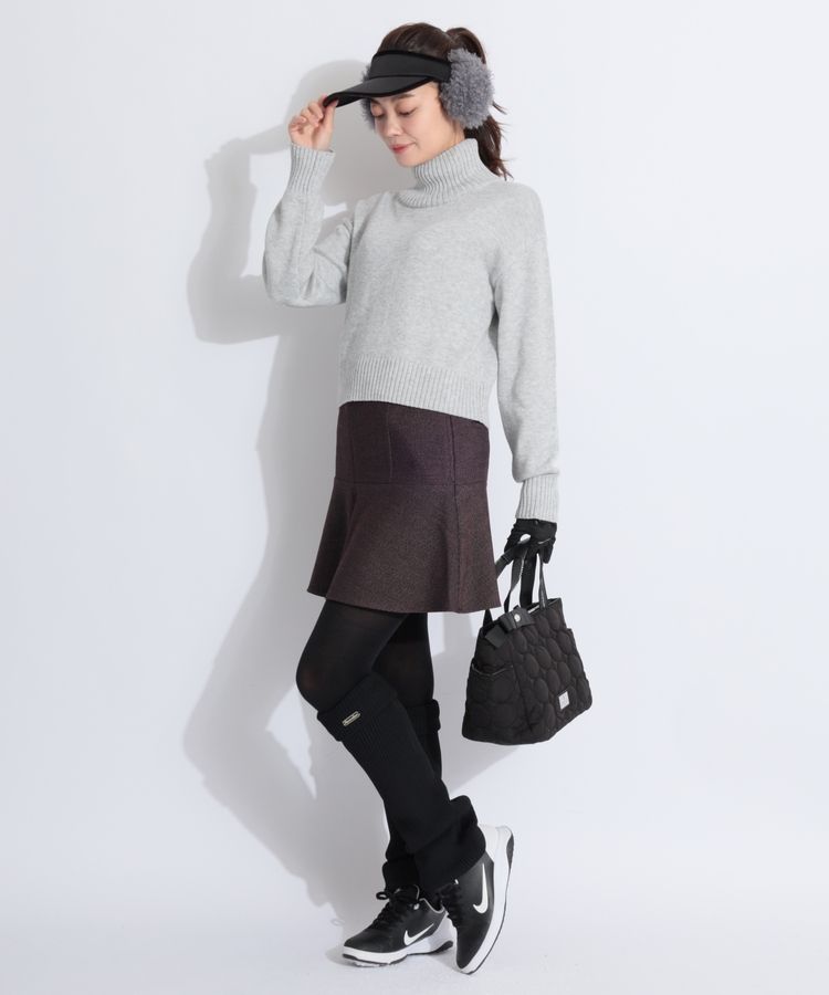 Mサイズ着丈44.5cmの長め丈で、着ぶくれしにくい三層防風フリース素材のAラインスカート。 長め丈でもストレッチが効いていて動きやすいのが魅力。 落ち着いたシルエットで、大人ゴルファーが上品に着こなせる一枚です。